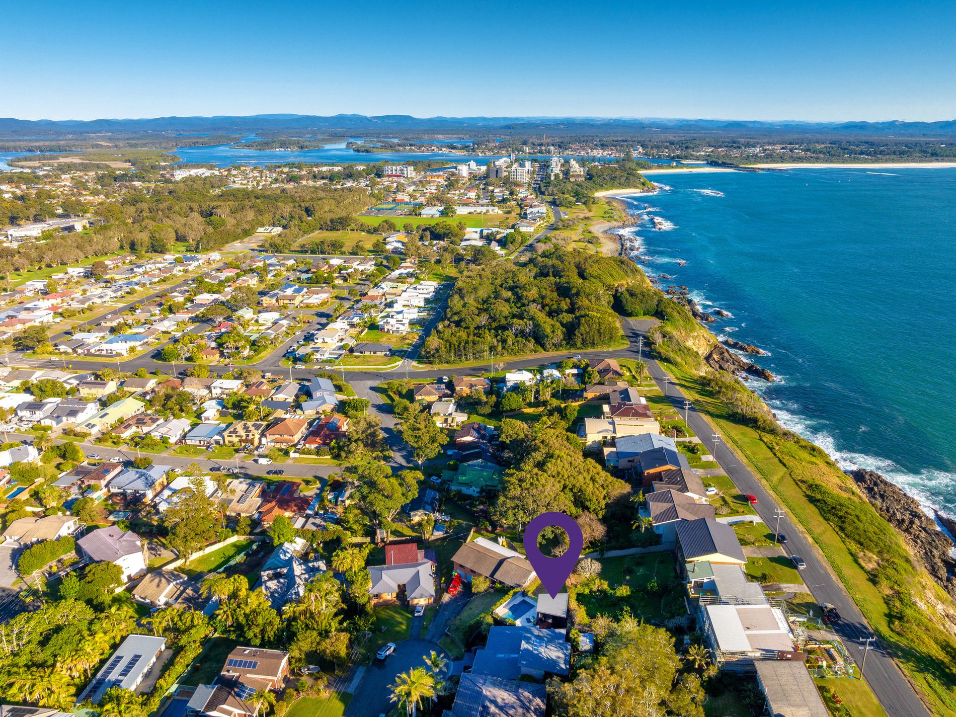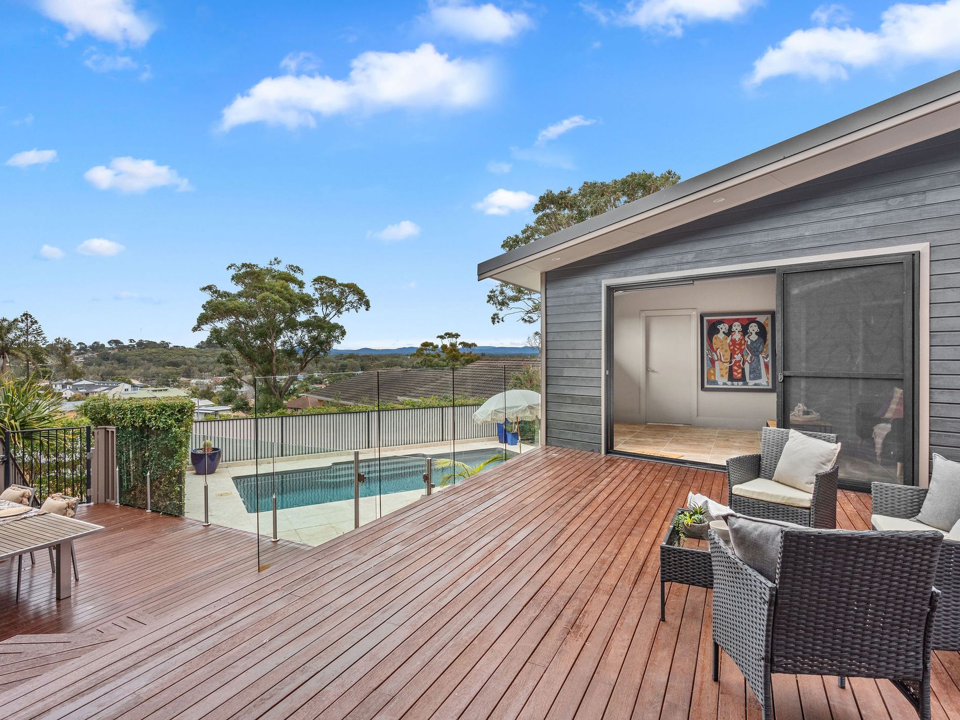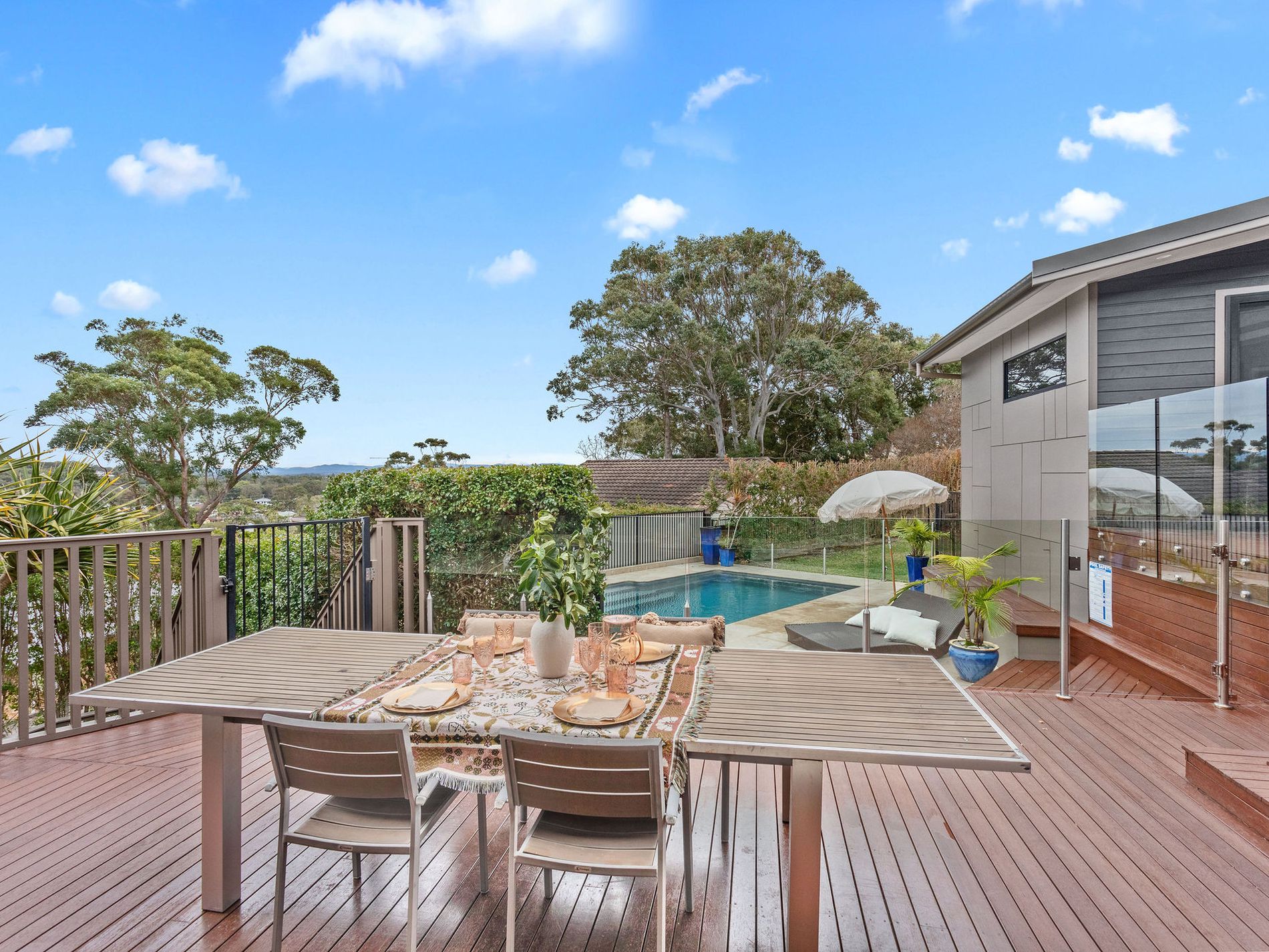 The sunsets at Bernhardt are a specialty and feature year-round with views out to the hinterland, the town lights up from here at night and the privacy of the home for entertaining completes the package. Timber stairs lead down to the crystal-clear inground swimming pool. Every day is a holiday when you have this exquisite, summer-ready feature at your disposal!