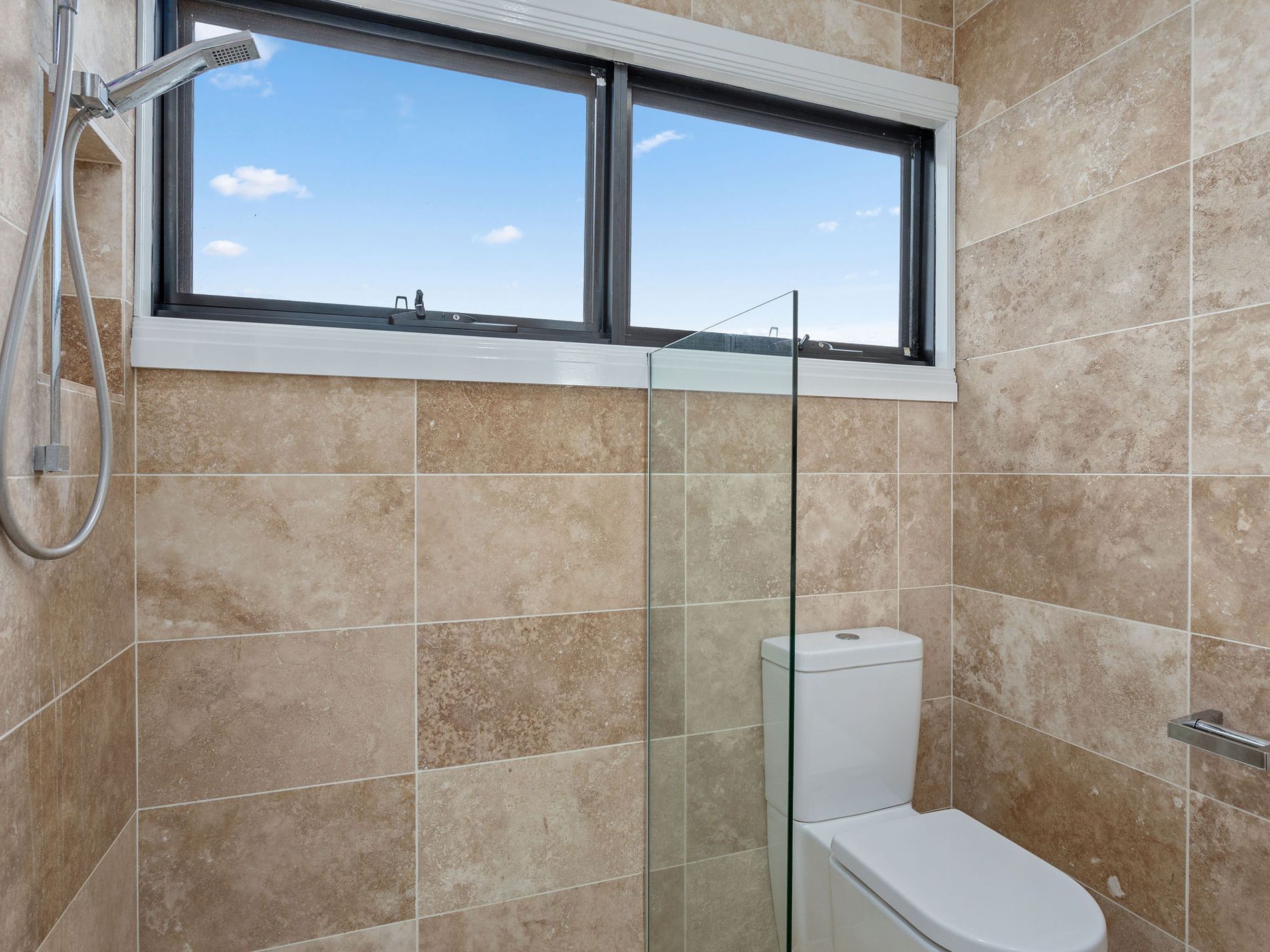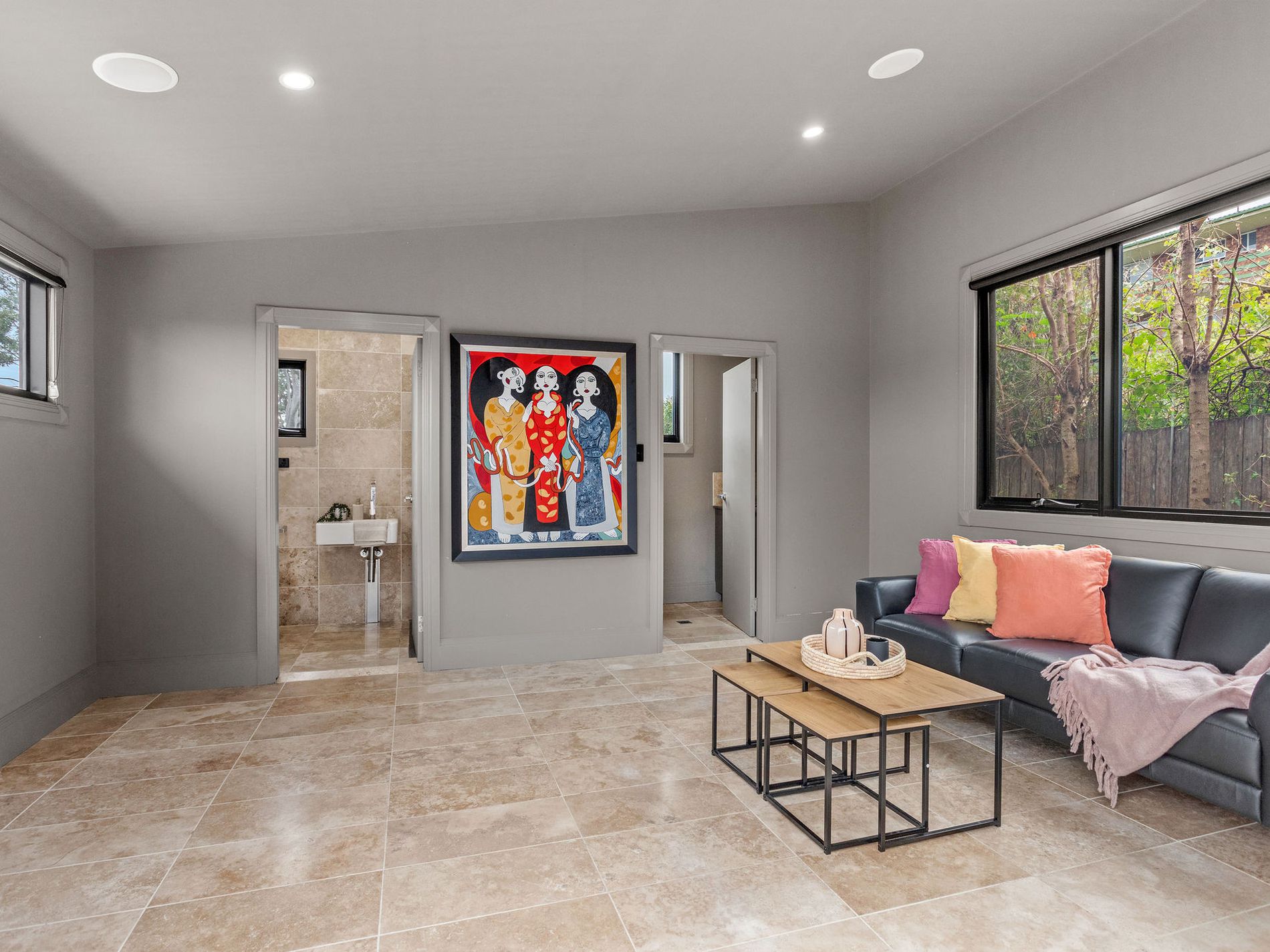 The brand-new deluxe kitchen anchors the heart of the home, with a split-level living room on one side and an open-plan dining area on the other. Impeccable aesthetics define this gourmet space, with a gas cooktop, and pendant lighting hanging from the soaring ceilings working to dazzling visual effect. Stone benchtops, an island bench, and upmarket stainless-steel appliances contribute to the kitchen of your dreams.